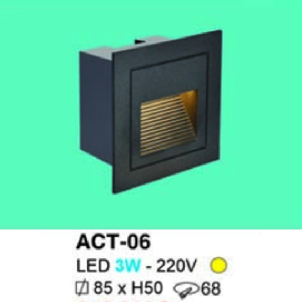 - Sản phẩm: HF - ACT - 06: Đèn âm tường/ âm bậc cầu thang - KT: 85mm x 85mm x H50mm - Lổ khoét: Ø68mm - Đèn LED 3W - 220V ánh sáng vàng