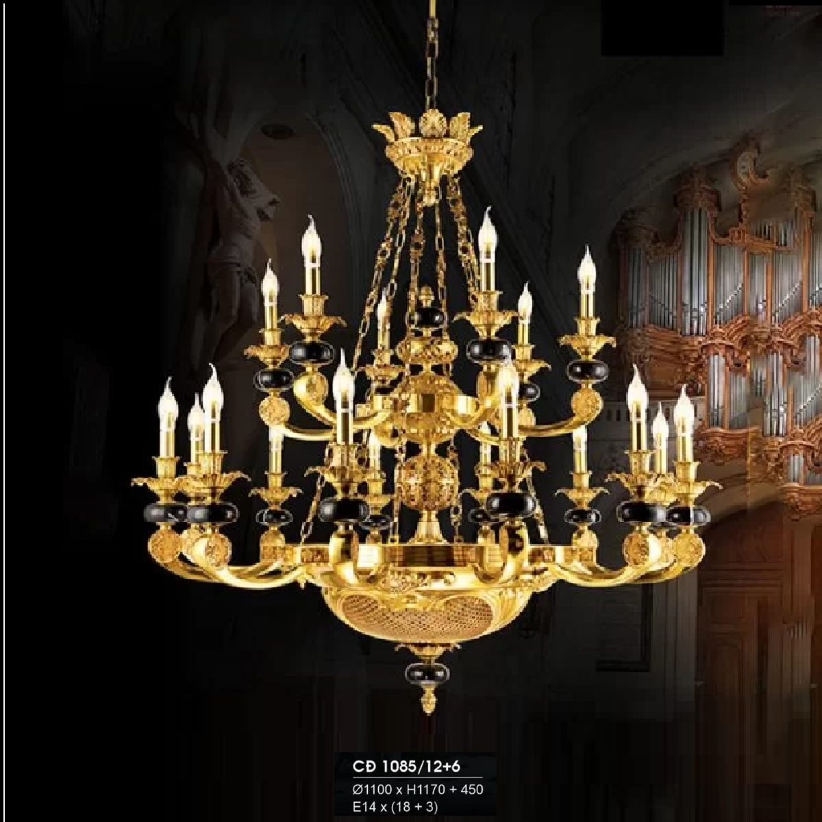 - Sản phẩm: HF- CĐ 1085/12+6: Chùm đồng 18 tay, đá đen - KT: Ø1100mm x H1170mm + 450mm - Bóng đèn chân E14 x 21 bóng