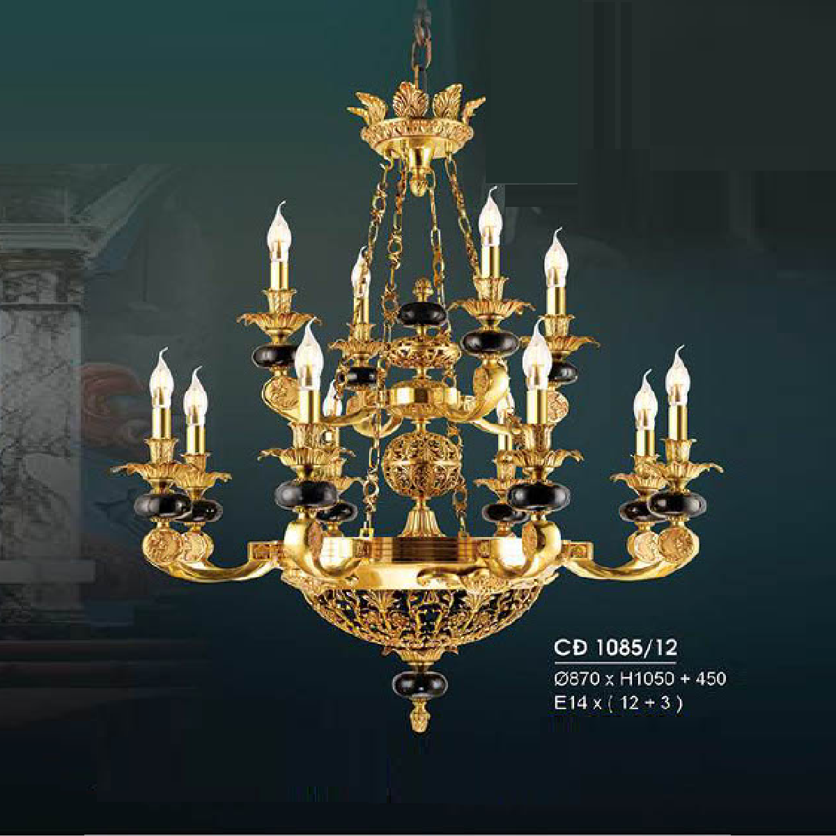 - Sản phẩm: HF - CĐ 1085/12: Đèn chùm đồng 12 tay - KT: Ø870mm x H1050mm + 450mm - Bóng đèn nến E14 x 15 bóng