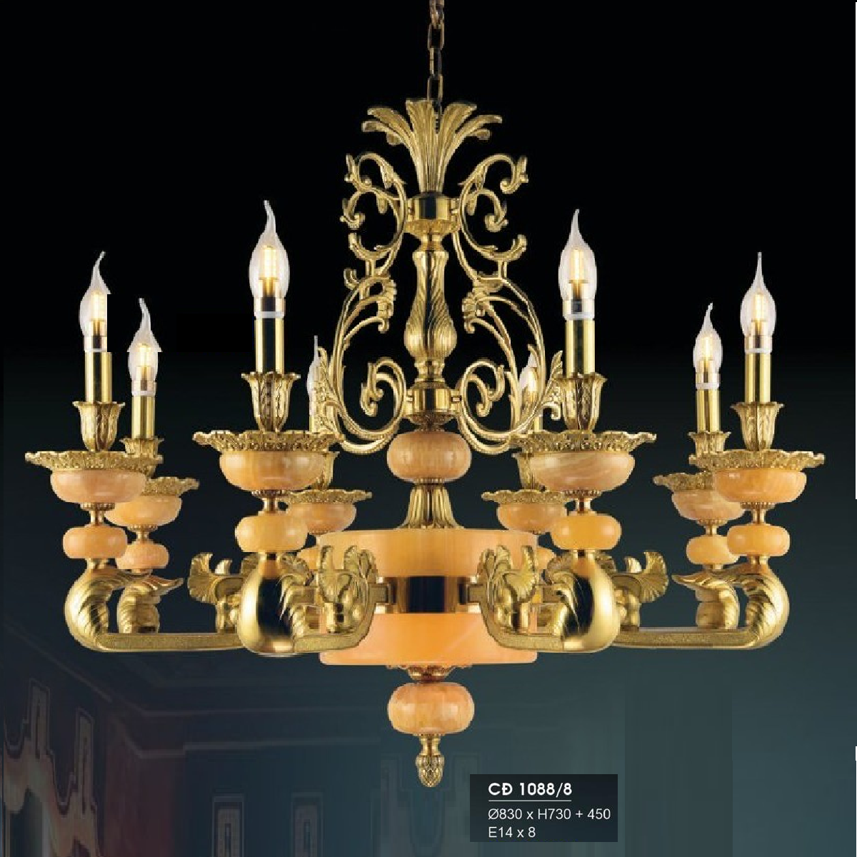 HF- CĐ 1088/8: Chùm đồng 8 tay, chao đá - KT: Ø830mm x H730mm + 450mm - Bóng đèn chân E14 x 8 bóng