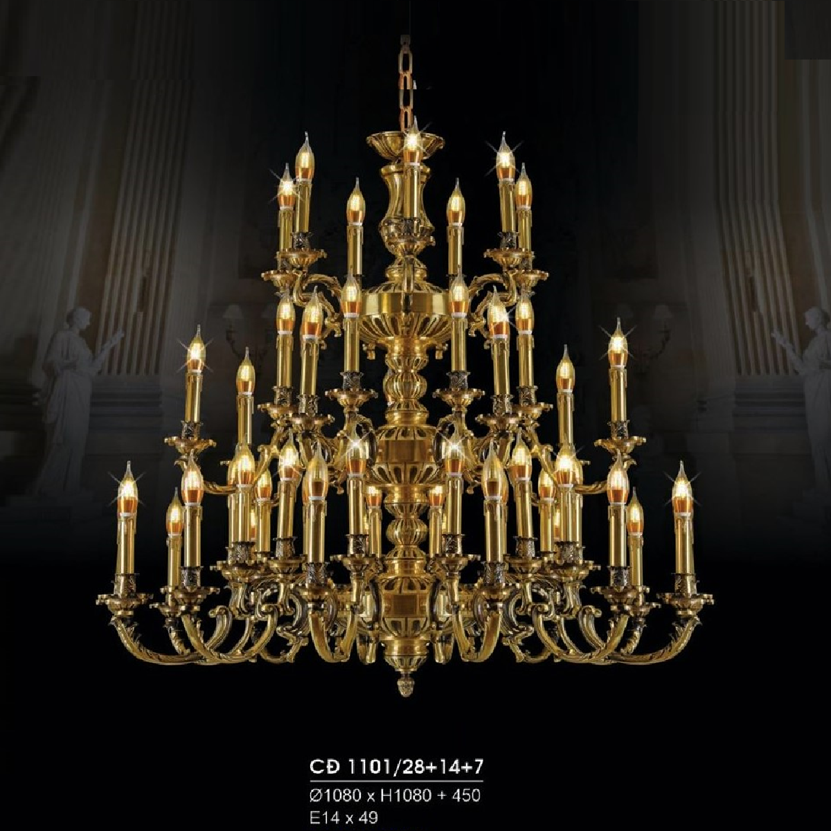 • Sản phẩm: HF - CĐ 1101/28+14+7: Chùm đồng nến 49 tay - KT: Ø1080mm x H1080mm + 450mm - Bóng đèn chân E14 x 49 bóng