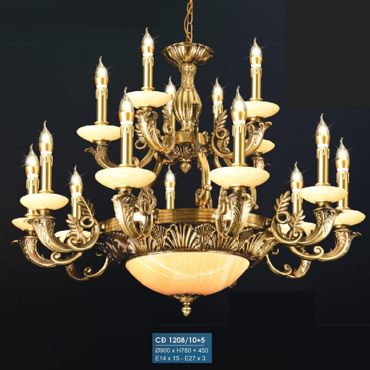 5. HF - CĐ 1208/10+5: Chùm đồng 18 tay, chao đá - KT: Ø900mm x H780mm + 450mm - Bóng đèn chân E14 x 18 bóng + E27 x 3 bóng