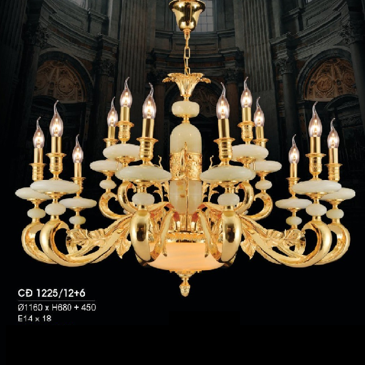 • Sản phẩm: HF - CĐ 1225/12+6: Chùm đồng 18 tay, chao đá trắng - KT: Ø1160mm x H880mm x 450mm - Bóng đèn chân E14 x 18 bóng