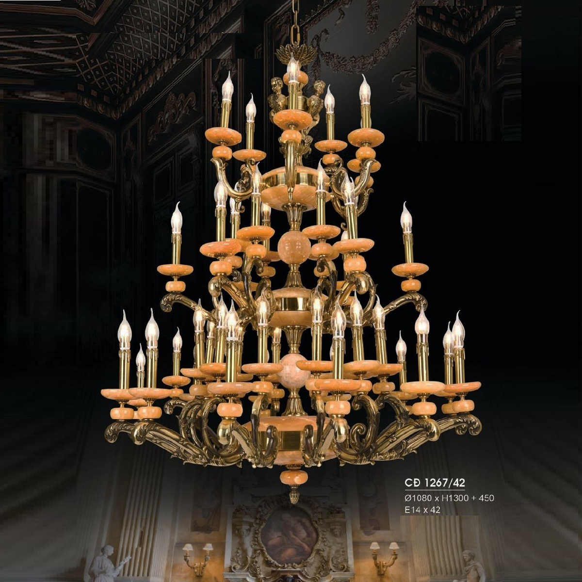 • Sản phẩm: HF - CĐ 1267/42: Chùm đồng 42 tay, chén đá - KT: Ø1080mm x H1300mm + 450mm - Bóng đèn chân E14 x 42 bóng