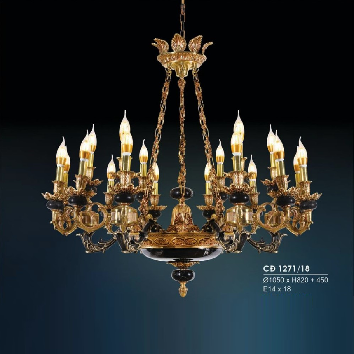 HF- CĐ 1271/18: Chùm đồng 18 tay, đá đen - KT: Ø1060mm x H980mm + 450mm - Bóng đèn chân E 14 x 18 bóng