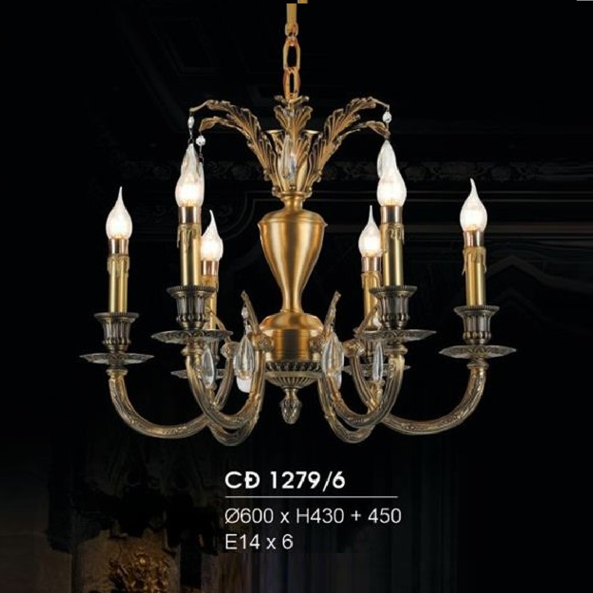 - Sản phẩm: HF- CĐ 1279/6: Chùm đồng 10tay - KT: Ø600mm x H430mm + 450mm - Đèn chân E14 x 6 bóng