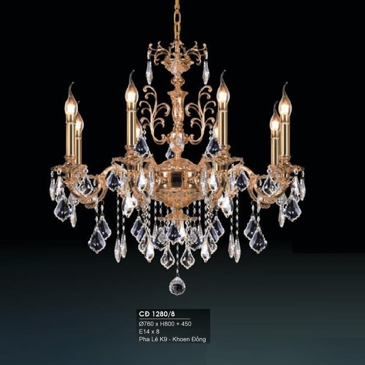 • Sản phẩm: HF - CĐ 1280/8: Đèn chùm đồng 8 tay, lá Phale - KT: Ø760mm x H800mm + 450mm - Bóng đèn nến E14 x 8 bóng