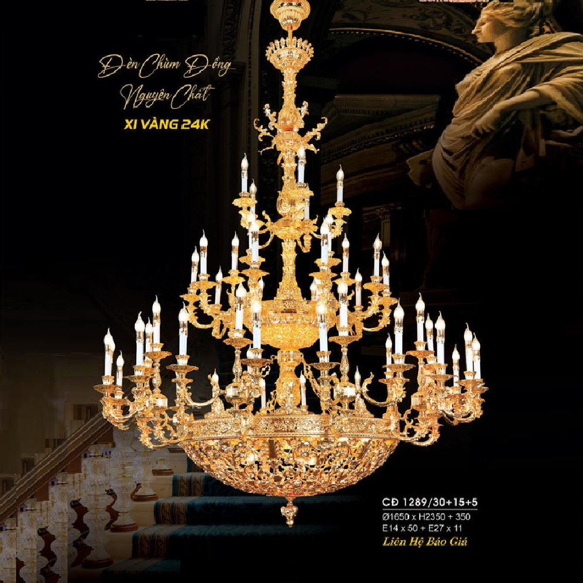 - Sản phẩm: HF - CD 1289/30+15+5: Đèn chùm đồng nguyên chất xi vàng 24K 50 tay - KT: 1650mm x H2350mm + 350mm - Bóng đèn E14 x 50 bóng