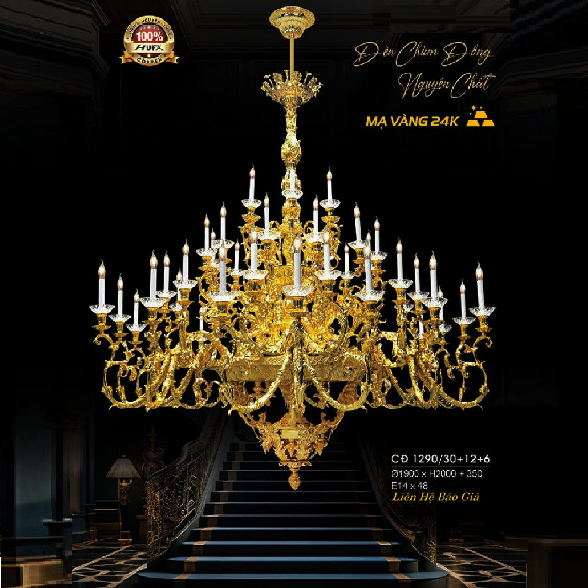 - Sản phẩm: HF - CD 1290/30+12+6: Đèn chùm đồng nguyên chất mạ vàng 24K 48 tay - KT: Ø1900mm x H2000mm +350mm - Bóng đèn E14 x 48 bóng