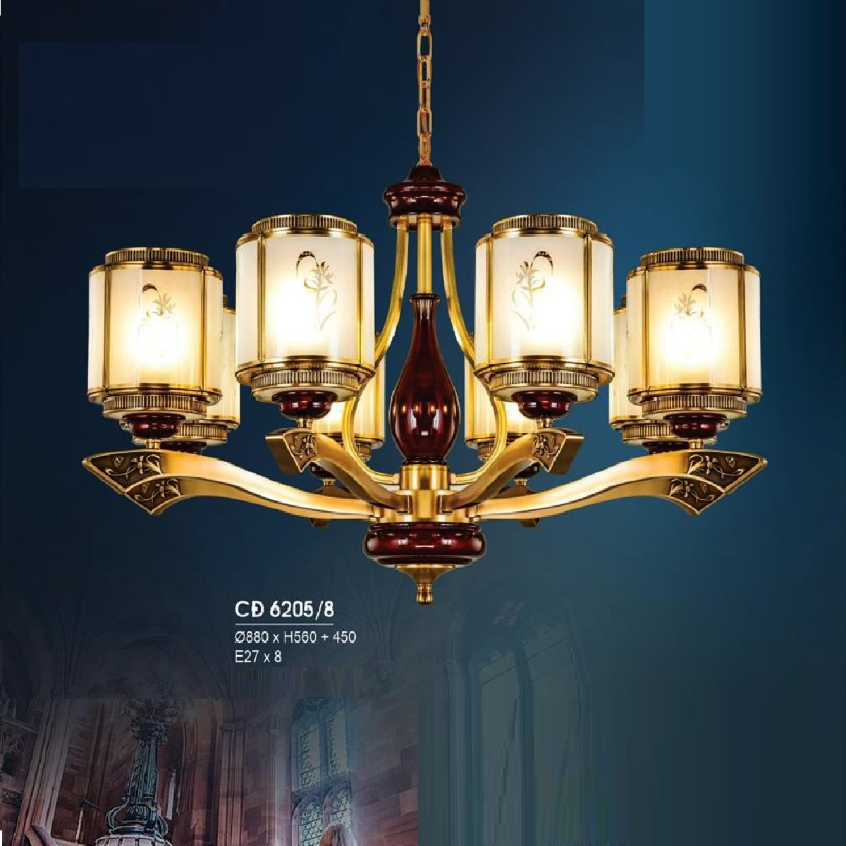 5. HF - CĐ 6205/8: Chùm đồng 8 tay, chao thuỷ tinh - KT: Ø850mm x H560mm + 450mm - Bóng đèn chân E27 x 8 bóng