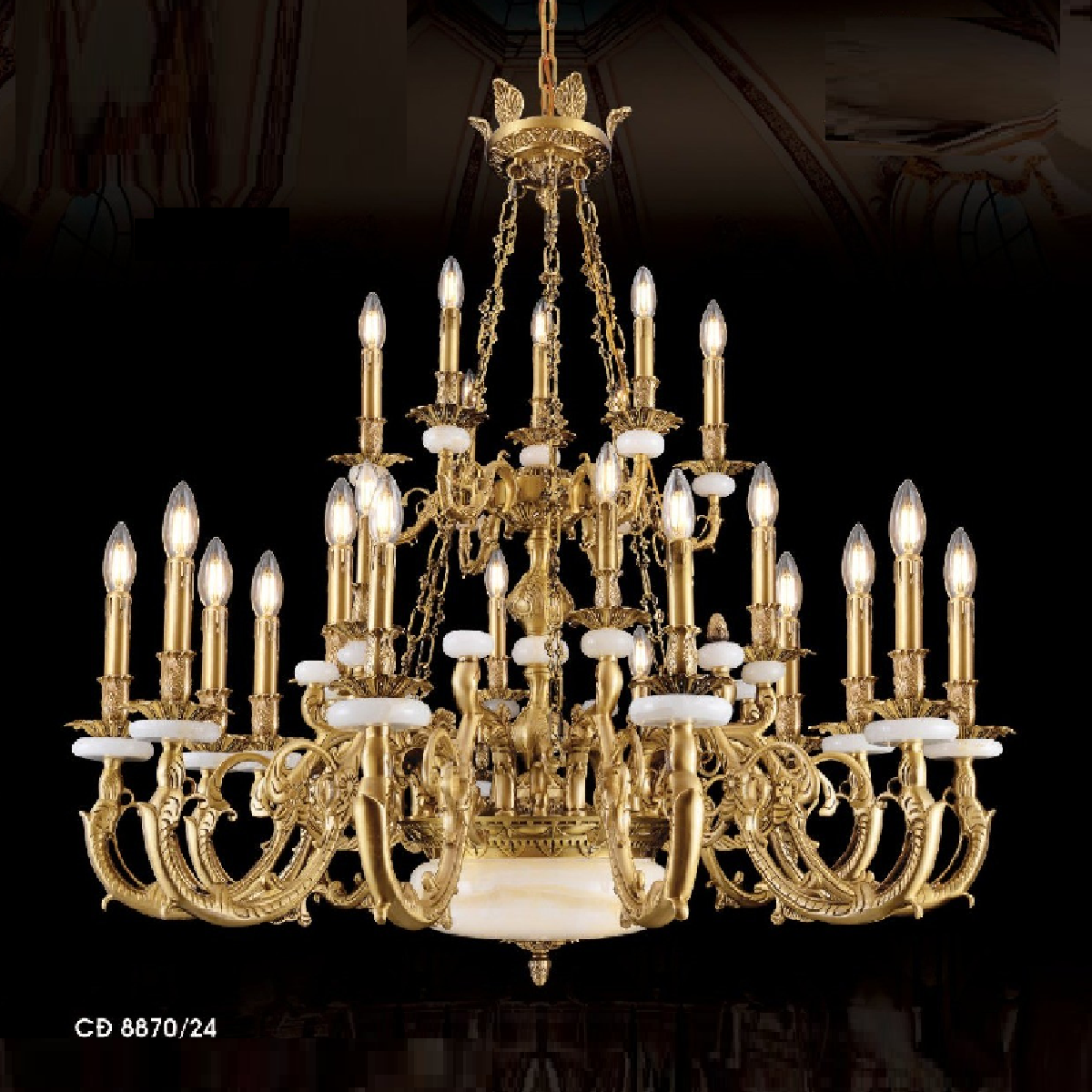 HF- CĐ 8870/24: Chùm đồng 24 tay, chao đá - KT: Ø1250mm x H1200mm + 450mm - Đèn chân E14 x 24 bóng