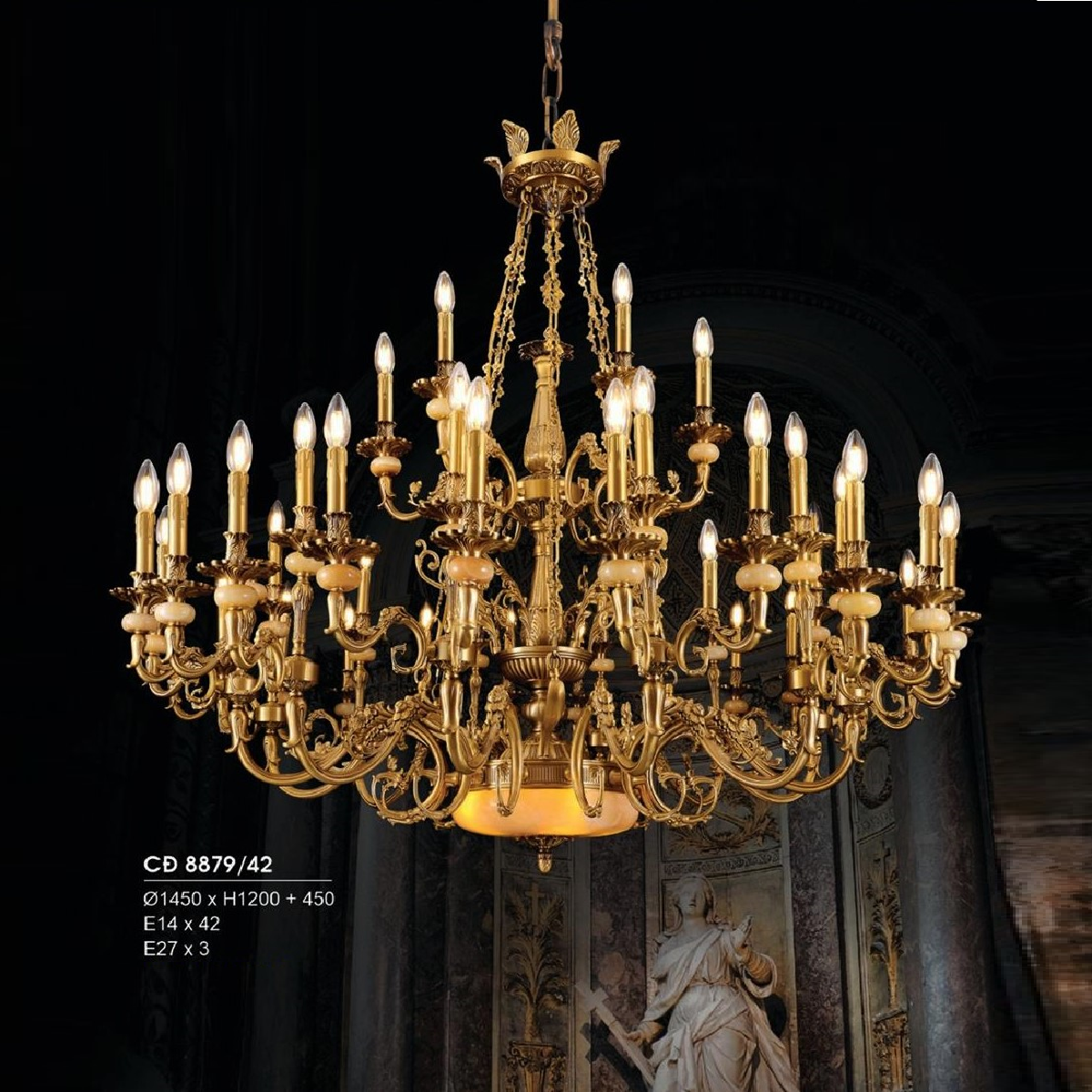 - Sản phẩm: HF- CĐ 8879/42: Chùm đồng 42 tay, chao đá - KT: Ø1450mm x H1200mm + 400mm - Bóng đèn chân E14 x 42 bóng
