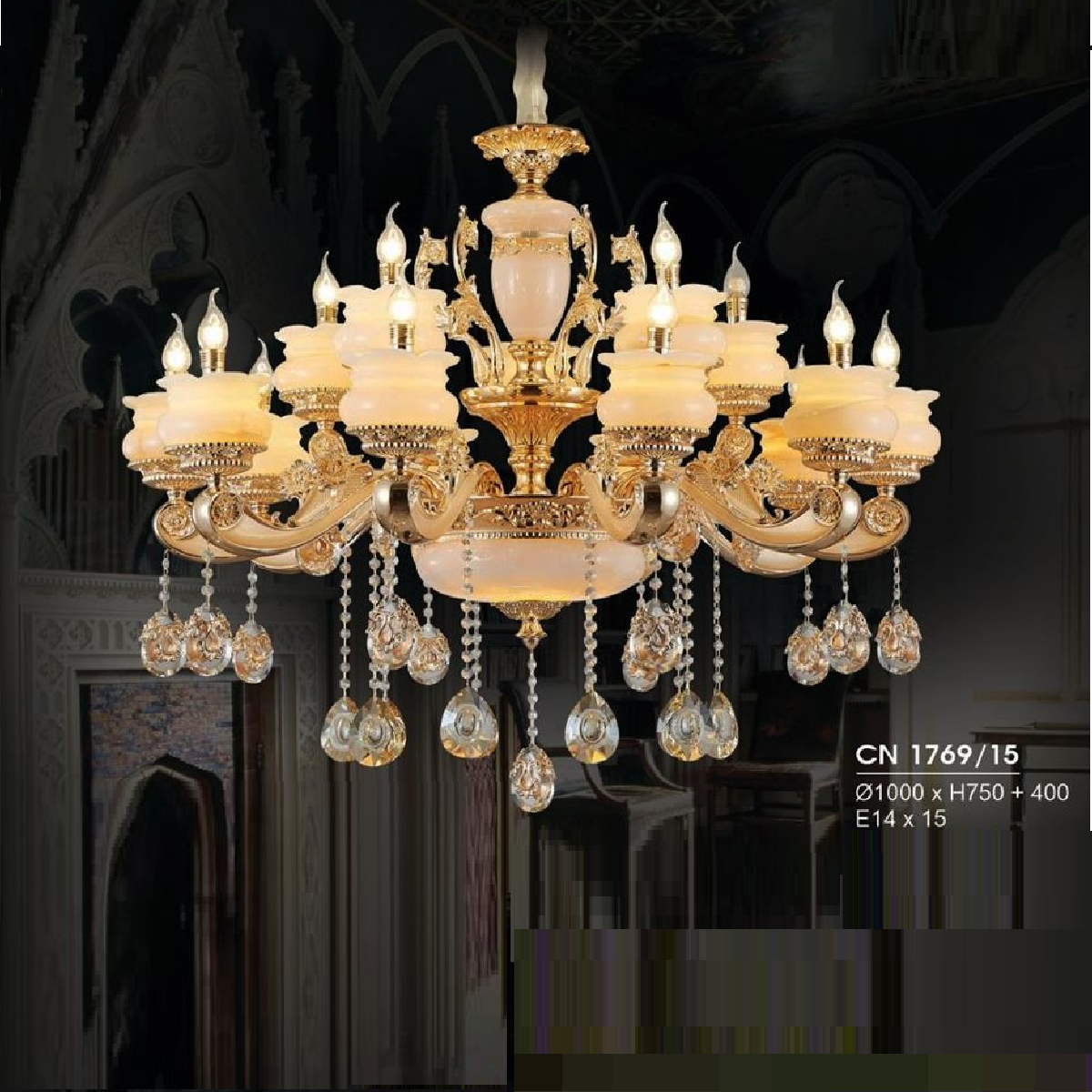 • Sản phẩm: HF - CN 1769/15: Đèn chùm nến 15 tay, chao đá - KT: Ø1000mm x H750mm + 400mm - Bóng đèn nến E14 x 15 bóng