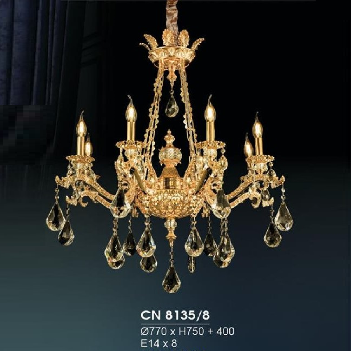 - Sản phẩm: HF - CN 8135/8: Đèn chùm nến 8 tay - KT: Ø770mm x H750mm + 400mm - Bóng đèn E14 x 8 bóng