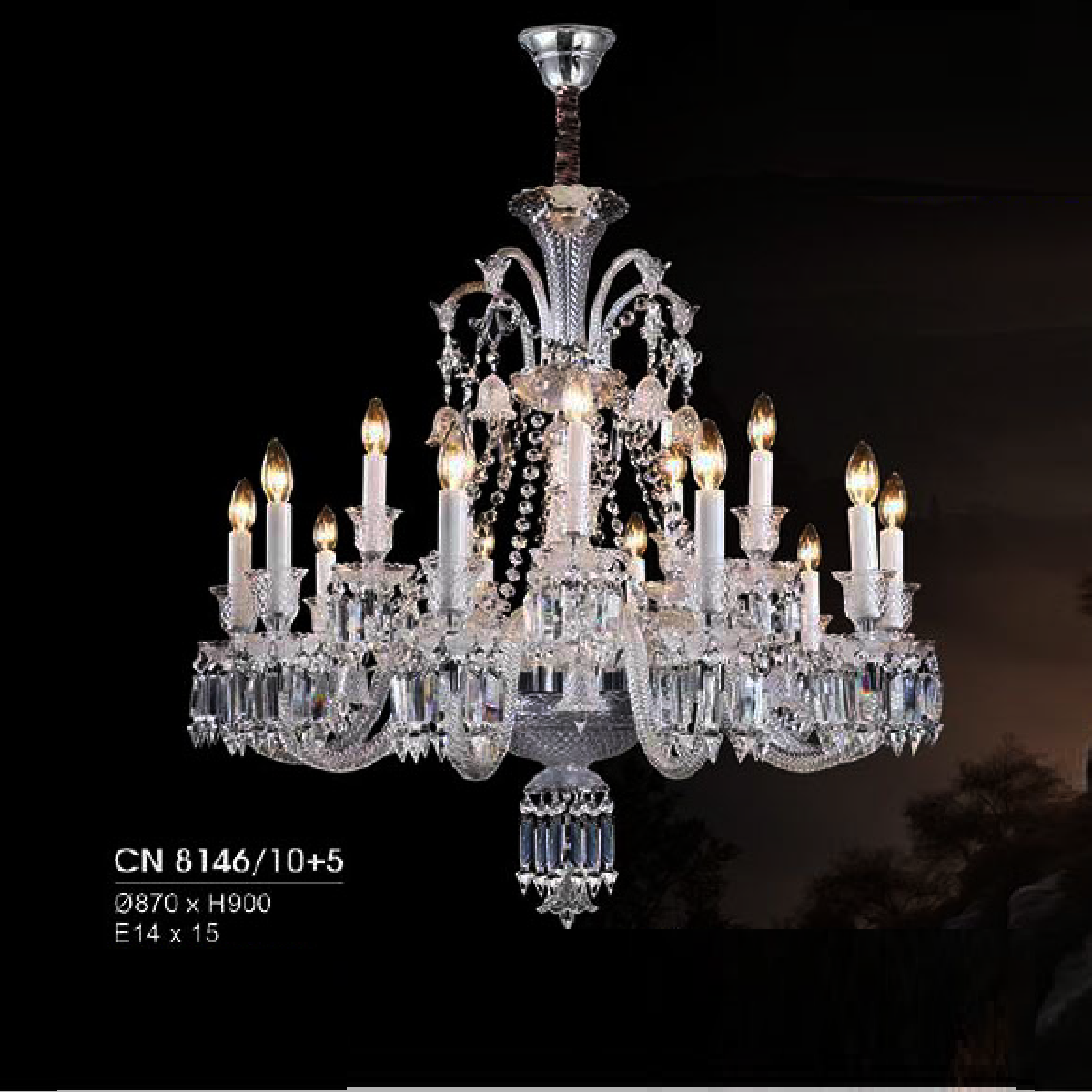 - Sản phẩm: HF - CN 8146/10+5: Đèn chùm nến Phale 15 tay - KT: Ø870mm x H900mm - Bóng đèn E14 x 15 bóng