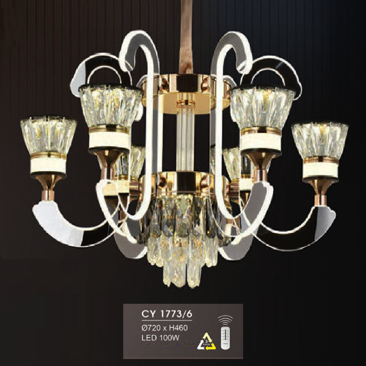 HF - CY - 1173/6: Đèn chùm LED 6 tay - KT: 720mm x H460mm - Đèn LED 100W đổi 3 màu