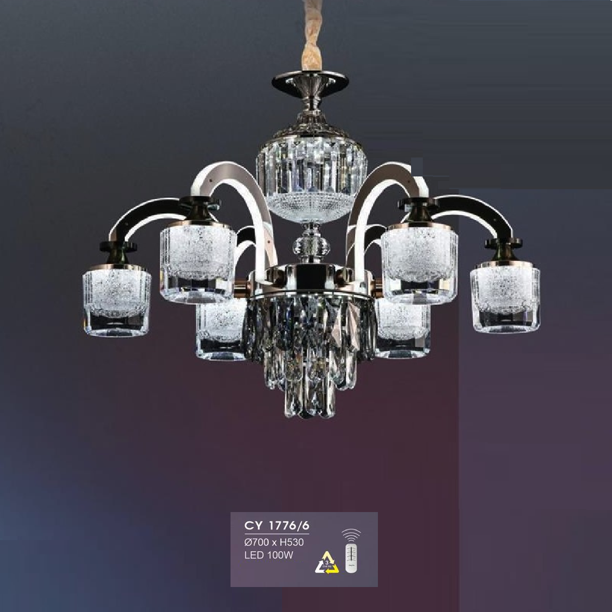 - Sản phẩm: HF - CY 1776/6: Đèn chùm LED 6 tay - KT: Ø700mm x H530mm - Đèn LED 100W đổi 3 màu - Remote
