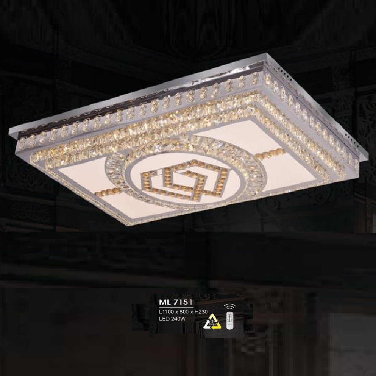 - Sản phẩm: HF - ML 7151: Đèn áp trần LED - KT: L1100m x W800mm x H230mm - Đèn LED 240W đổi 3 màu - Remote