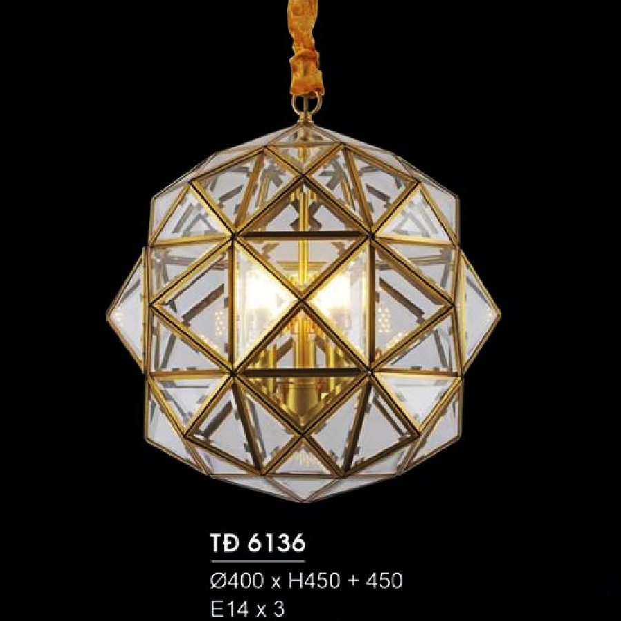- Sản phẩm: HF - TĐ - 6136: Đèn thả đồng - KT: Ø400mm x H450mm + 450mm - Đèn chân E14 x 3 bóng
