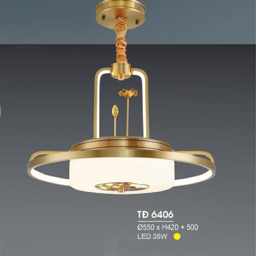 - Sản phẩm: HF - TĐ 6406: Đèn thả đồng - KT: Ø550mm x H420mm + 500mm - Đèn LED 35W ánh sáng vàng