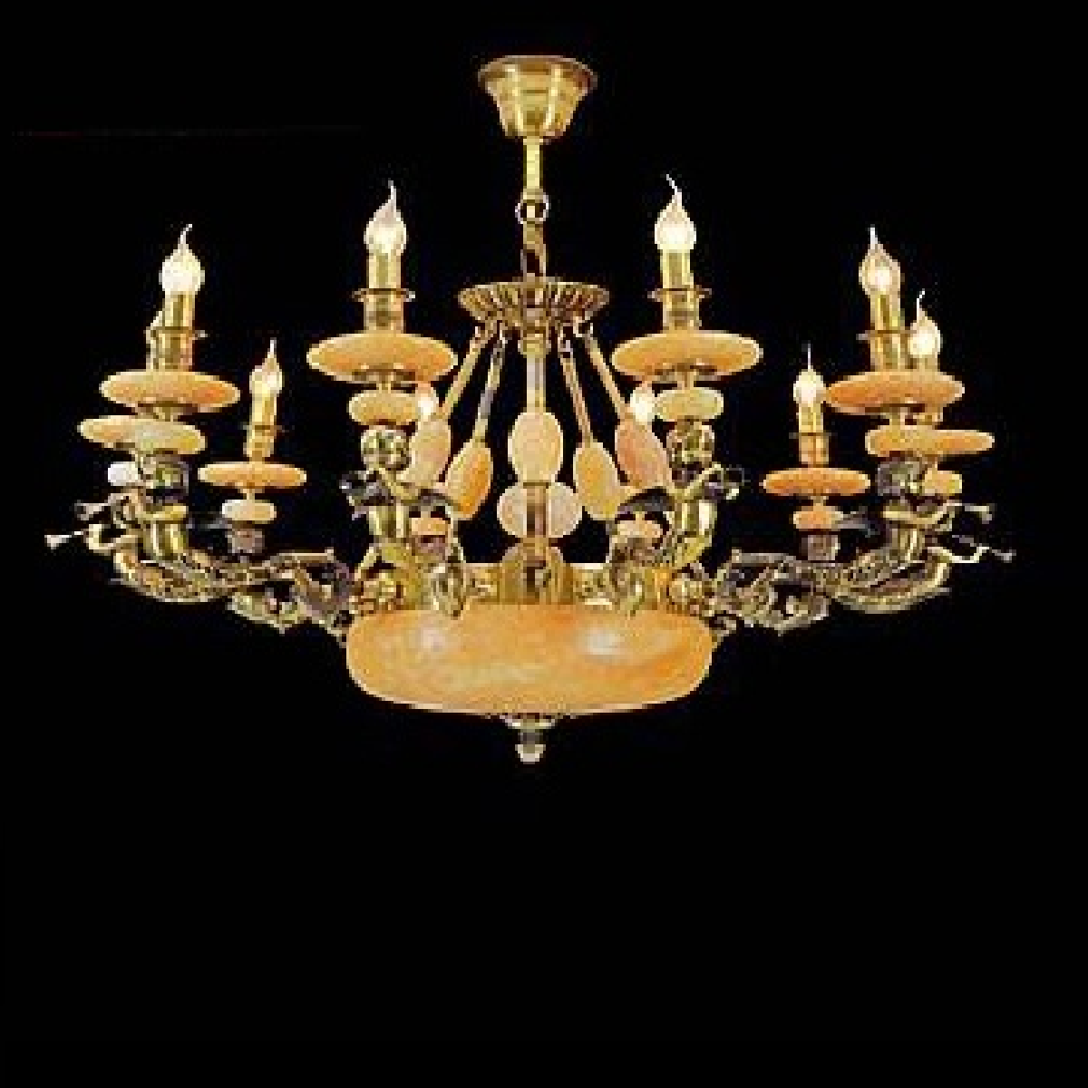 - Sản phẩm: CDQT - 55: Chùm đồng 10 tay chao đá - KT: Ø900mm x H1100mm - Bóng đèn chân E 14 x 10 bóng