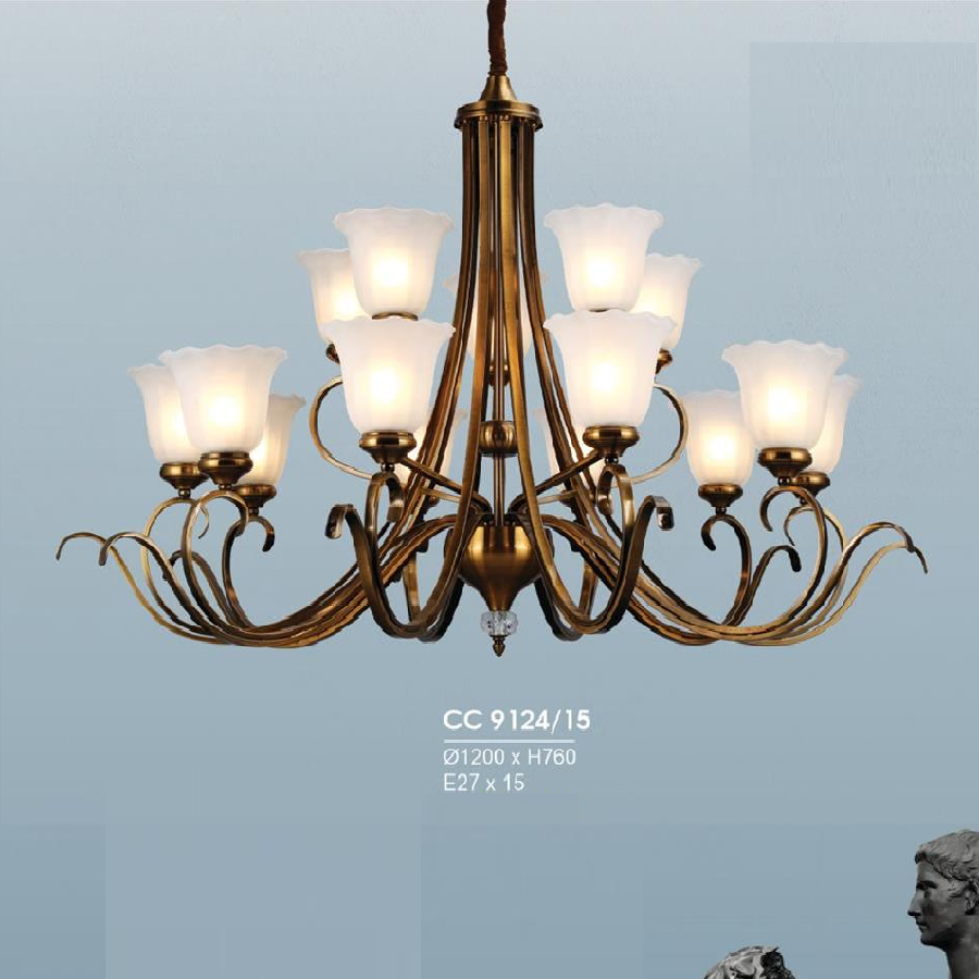 5. HF - CC 9124/15: Đèn chùm 15 tay, chao đèn thủy tinh - KT: Ø1200mm x H760mm - Bóng đèn E27 x 15 bóng