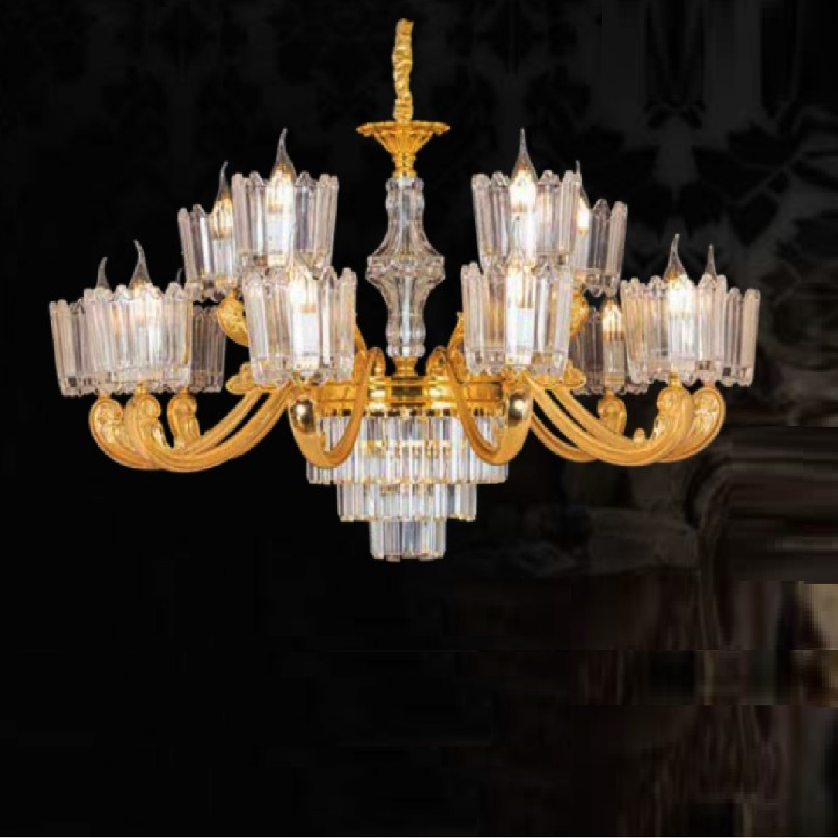 CNQT - 257: Đèn chùm nến  phale K9 15 tay - KT: Ø950mm x H1100mm - Bóng đèn nến chân E14 x 15 bóng
