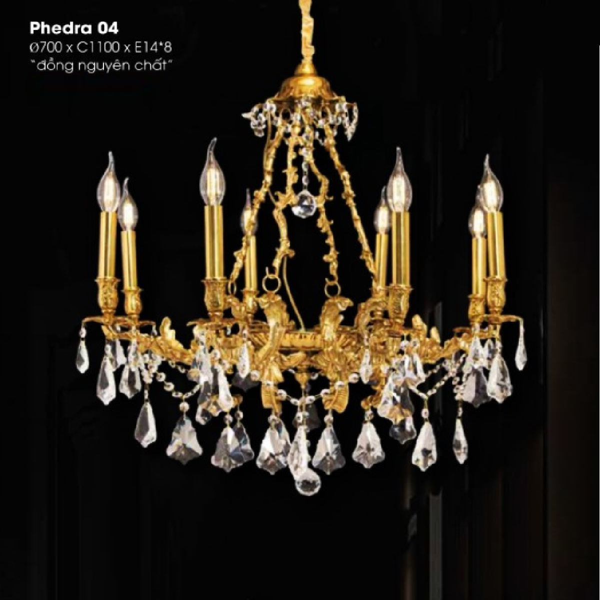 - Sản phẩm: Phedra 04: Đèn chùm đồng nguyên chất 8 tay, hạt Phale - KT: Ø700mm x H1100mm - Bóng đèn chân E14 x 8 bóng