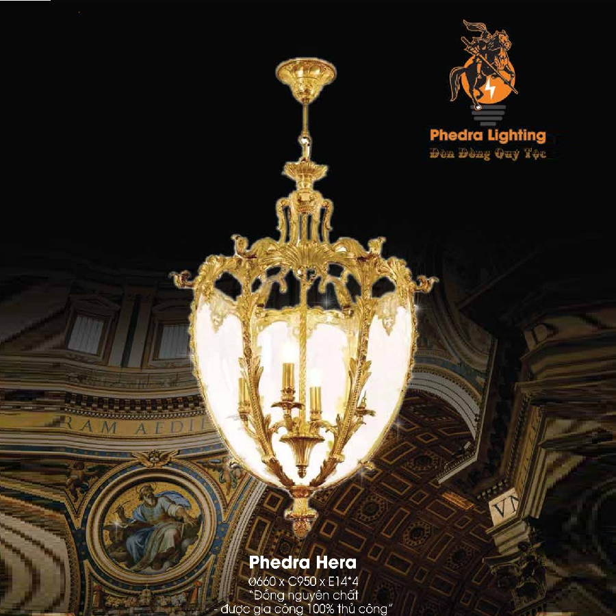 - Sản phẩm: LH - Phedra Hera: Đèn thả đồng Quý tộc chao thủy tinh - KT: Ø660mm x H950mm - Đèn chân E14 x 4 bóng