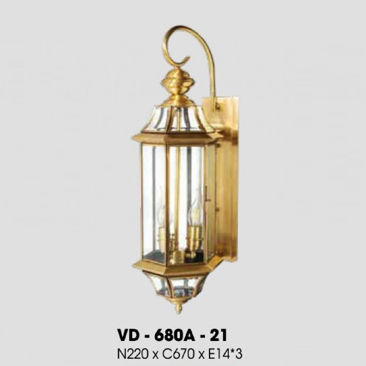 - Sản phẩm: VD - 680A-21: Đèn gắn tường ngoài trời xi mạ đồng - KT: W220mm x H670mm - Bóng đèn E14 x 3 bóng