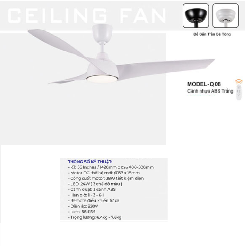 - Sản phẩm: MODEL - Q08: Quạt trần đèn 3 cánh nhựa ABS màu trắng