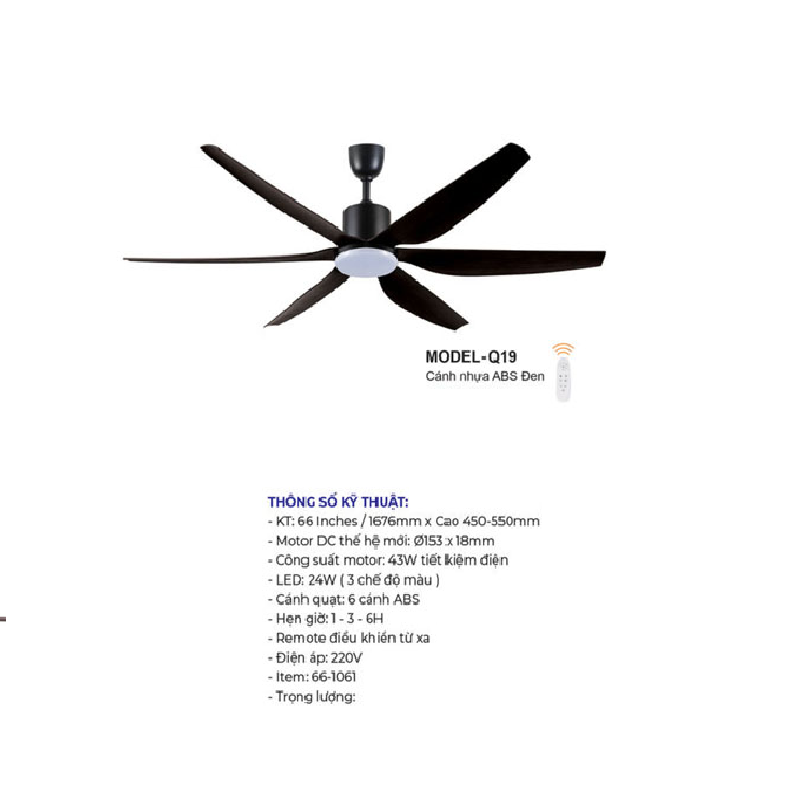 - Sản phẩm: MODEL - Q19: Quạt trần đèn 6 cánh nhựa ABS màu đen