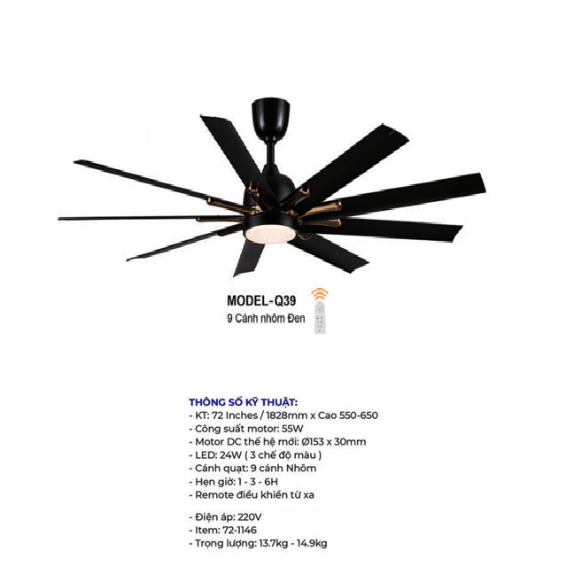• Sản phẩm: MODEL - Q39: Quạt trần đèn 9 cánh nhôm đen
