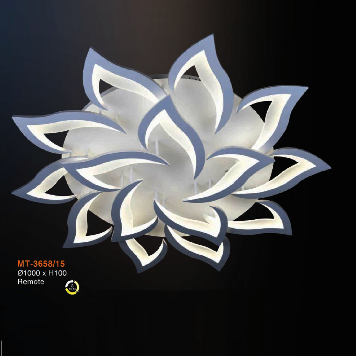 • Sản phẩm: MT - 3658/15: Đèn áp trần LED Mica 15 cánh - KT: Ø1000mm x H100mm - Đèn LED đổi 3 màu + Remote