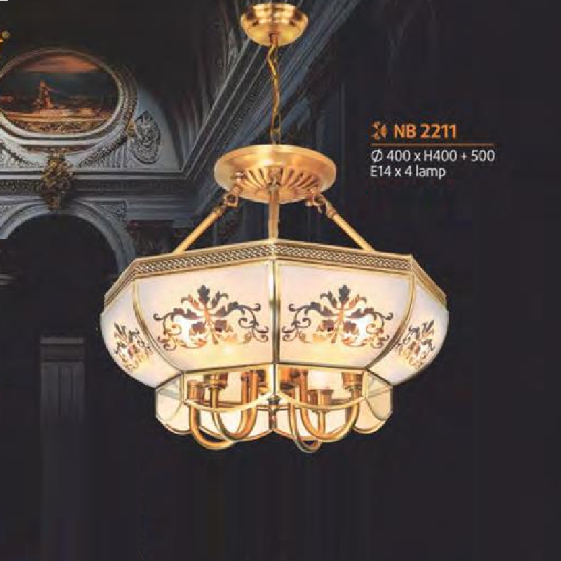 • Sản phẩm: NB 2211: Đèn thả đồng chao thủy tính - KT: Ø400mm x H400mm + 500mm - Bóng đèn E14 x 4 bóng