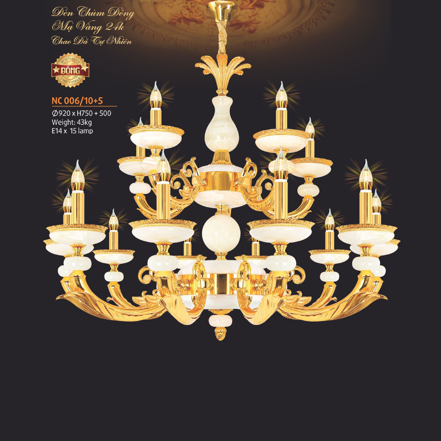 • Sản phẩm: NC 006/10+5: Đèn chùm đồng chao đá 15 tay - KT: Ø920mm x H750mm +500mm - Bóng đèn E14 x 15 bóng
