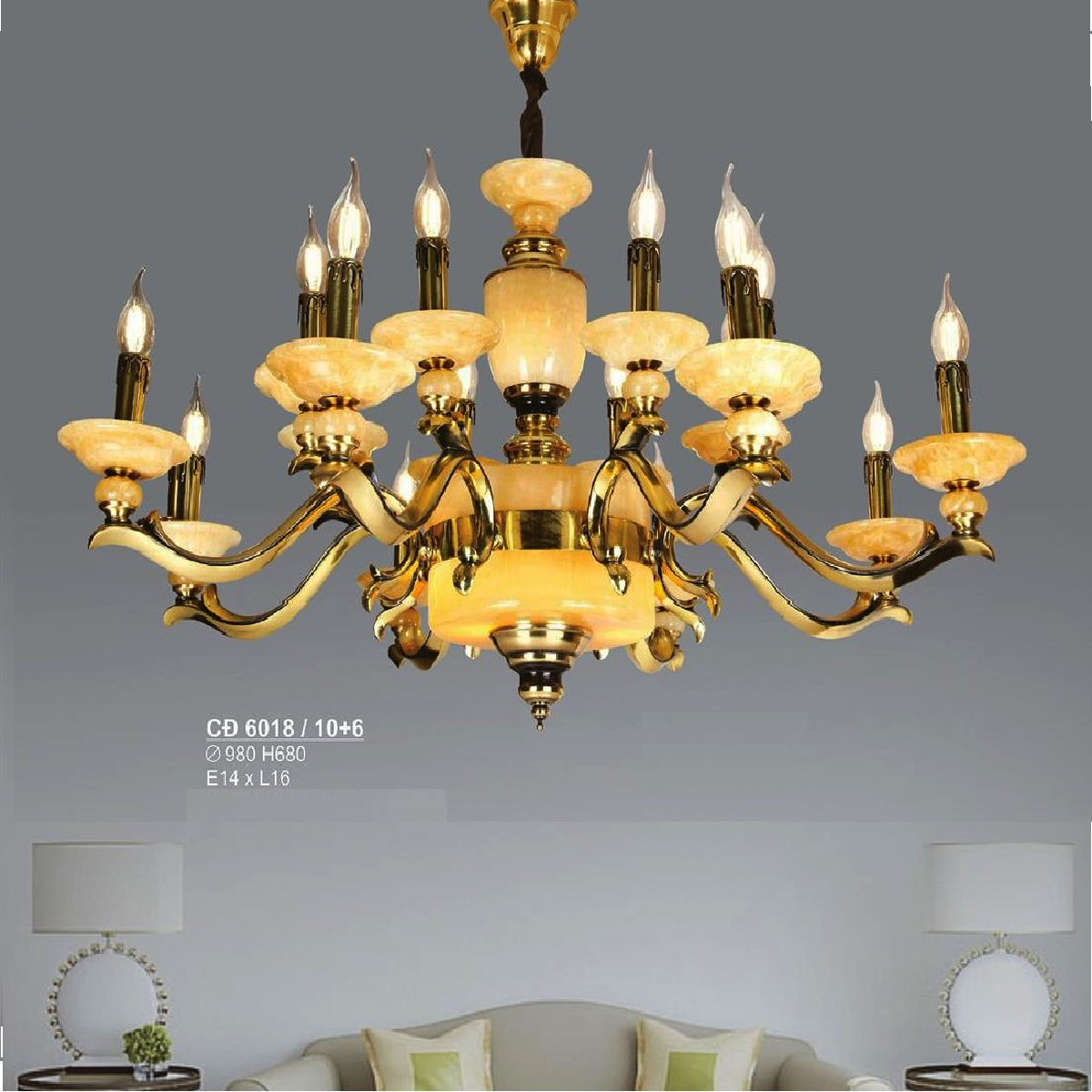 - Sản phẩm: S - CĐ 6018/10+6: Đèn chùm đồng 16 tay, chao đá thiên nhiên - KT: Ø980mm x H680mm - Bóng đèn chân E 14 x 16 bóng