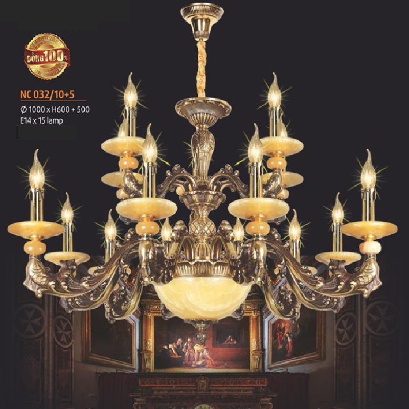 - Sản phẩm: NC 032/10+5: Đèn chùm đồng 15 tay, chao đá - KT: Ø1000mm x H600mm + 500mm - Bóng đèn chân E14 x 15 bóng + E 27 x 3 bóng