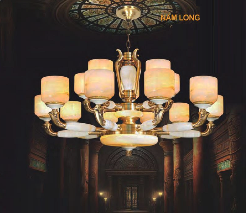 • Sản phẩm: NC 1008/15: Đèn chùm đồng, chao đá - KT: Ø1000mm x H550mm + 600mm - Bóng đèn E27 x 15 bóng