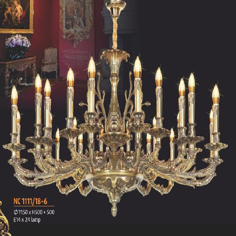 - Sản phẩm: NC 1111/18+6: Đèn chùm đồng 24 tay - KT: Ø1150mm x H600mm + 500mm - Bóng đèn chân E14 x 24 bóng