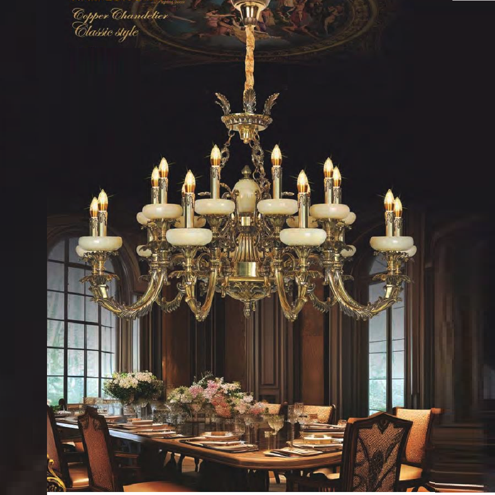 5. NC 1112/9+9: Đèn chùm đồng 18 tay, chén đá - KT: Ø1100mm x H700mm + 400mm - Bóng đèn chân E14 x 18 bóng