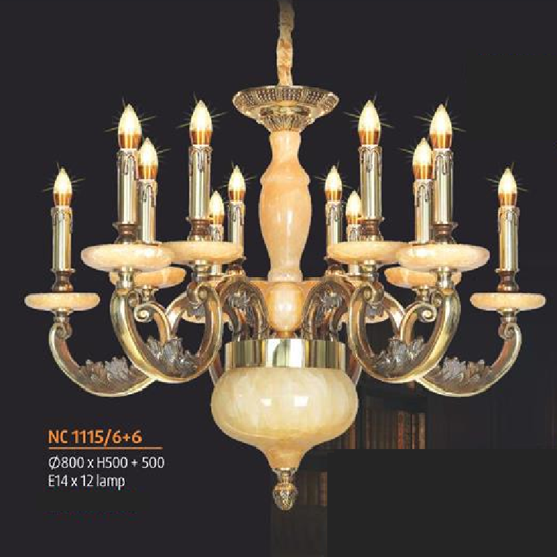 • Sản phẩm: NC 1115/6+6: Đèn chùm đồng 12 tay, chao đá - KT: Ø800mm x H500mm + 500mm - Bóng đèn chân E14 x 12 bóng