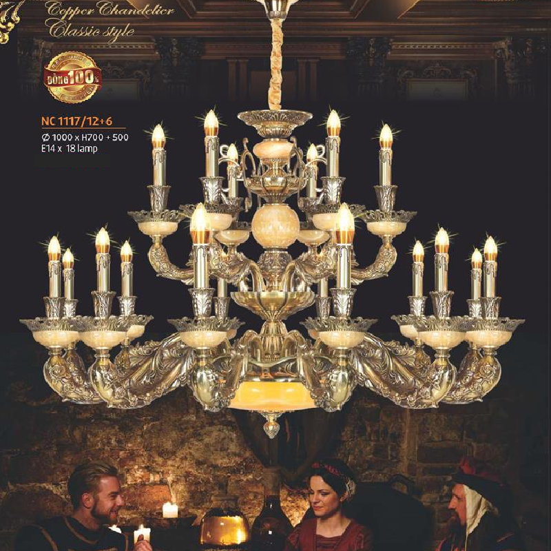• Sản phẩm: NC 1117/12+6: Đèn chùm đồng 18 tay, chao đá - KT: Ø1000mm x H 700mm + 500mm - Đèn chân E14 x 18 bóng