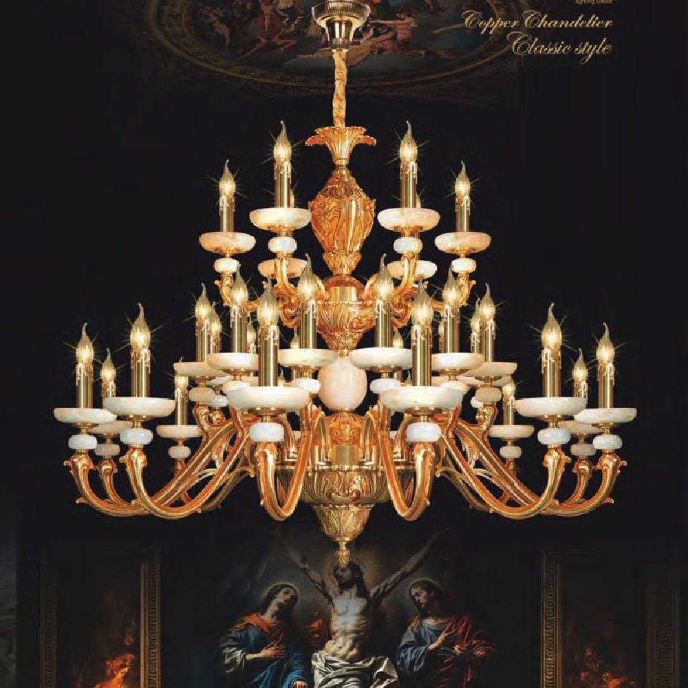 • Sản phẩm: NC 1245/12+12+6: Đèn chùm đồng 30 tay chao đá trắng - KT: Ø1050mm x H850mm +500mm - Bóng đèn nến E14 x 30 bóng