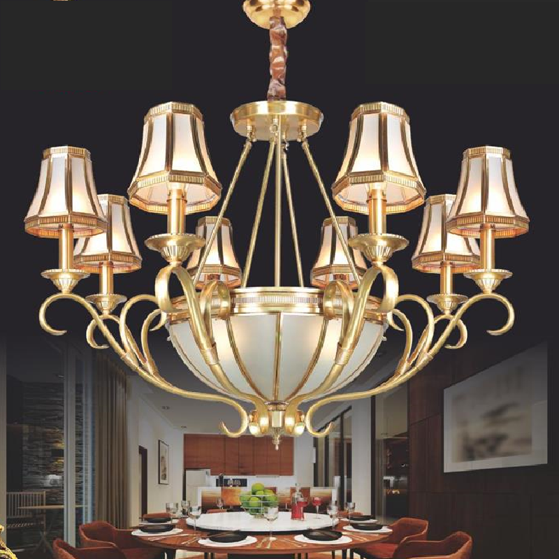 - Sản phẩm: NC 20153/8: Đèn chùm đồng 8 tay, cháo thủy tinh - KT: Ø900mm x H700mm + 600mm - Bóng đèn chân E27 x 3 bóng + E14 x 8 bóng