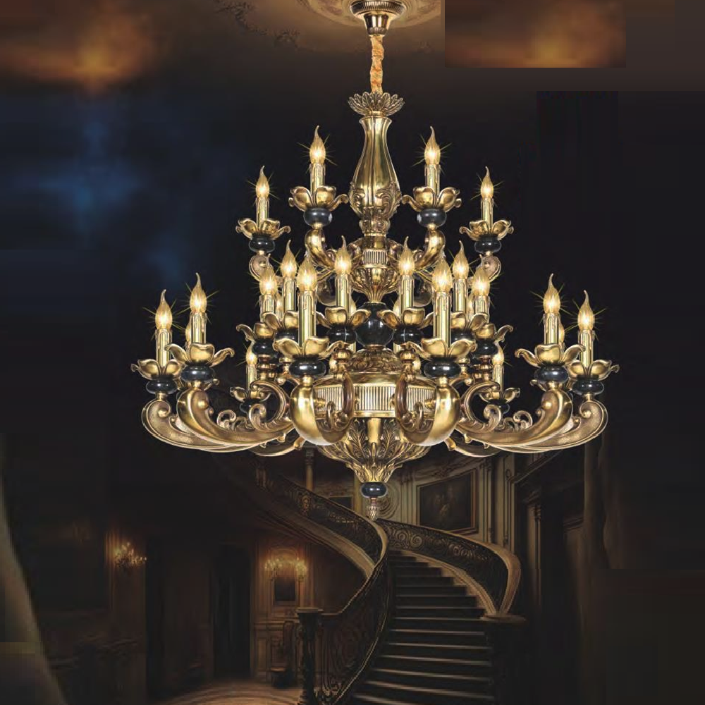 - Sản phẩm: NC 6020/12+12+6: Đèn chùm đồng 30 tay - KT: Ø1000mm x H1000mm + 600mm -Bóng đèn chân E14 x 30 bóng