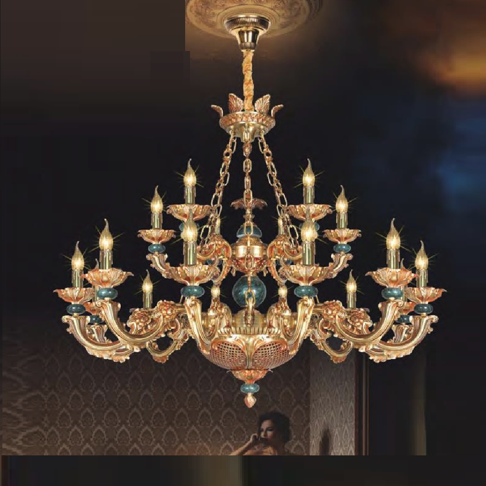 5. NC 6026/12+6: Đèn chùm đồng 18 tay, đá xanh - KT: Ø 1100mm x H1000mm + 600mm - Bóng đèn chân E 14 x 18 bóng