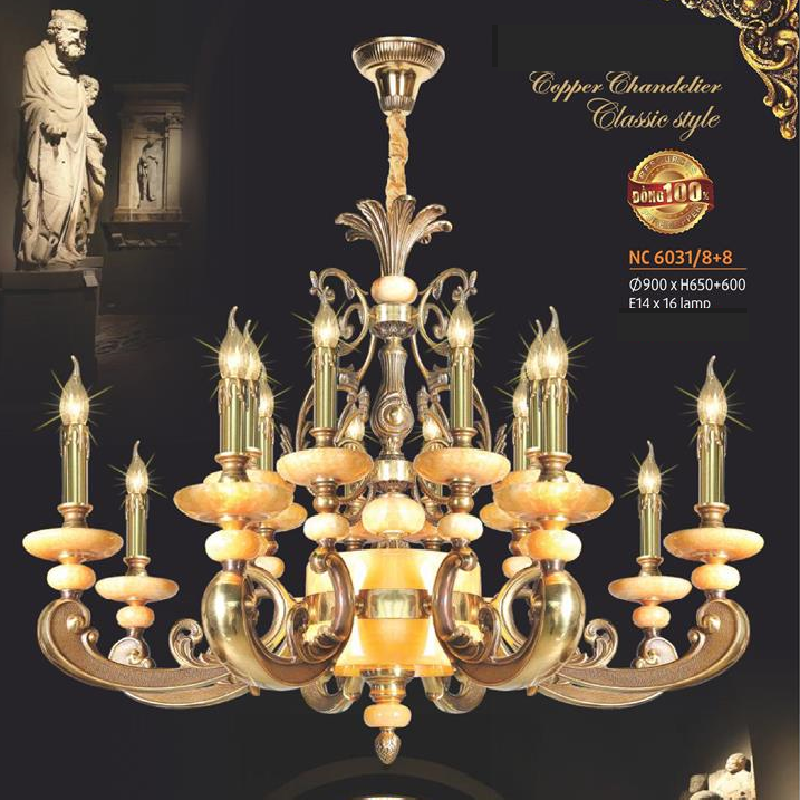- Sản phẩm: NC 6031/8+8: Đèn chùm đồng 16 tay chao đá - KT: Ø900mm x H650mm + 600mm - Bóng đèn chân E14 x 16 bóng