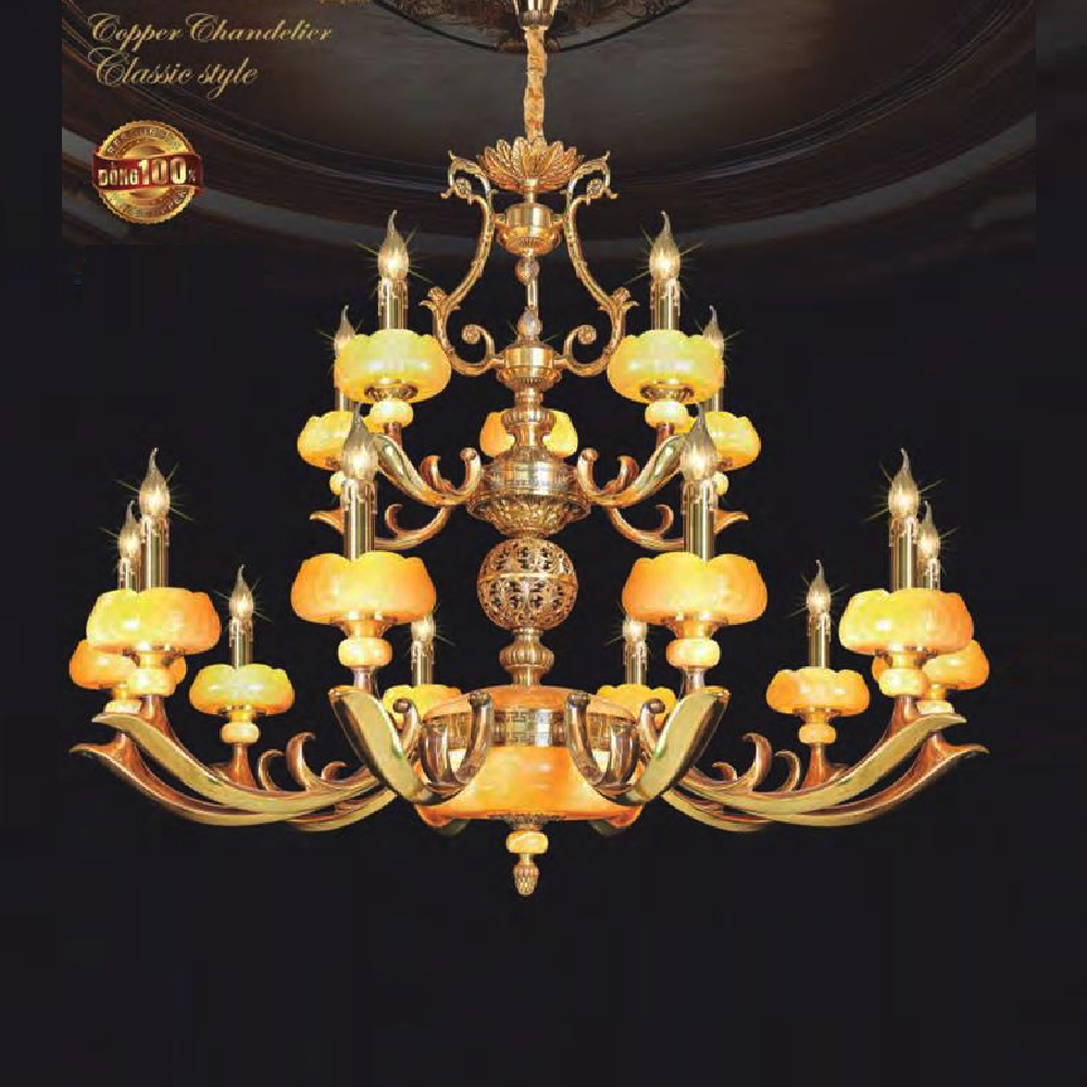 - Sản phẩm: NC 6053/10+5: Đèn chùm đồng, chao đá 15 tay - KT: Ø1100mm x H900mm +500mm - Bóng đèn nến chân E14 x 15 bóng