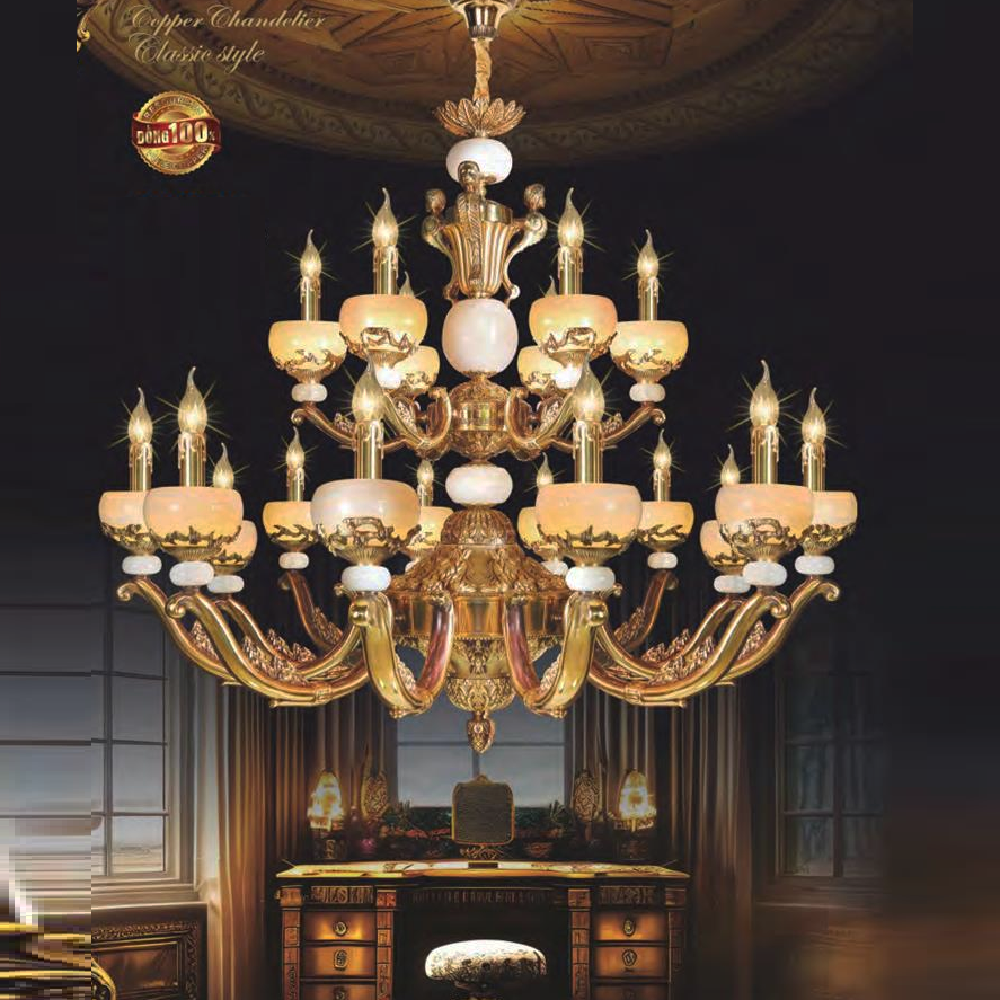 - Sản phẩm: NC 6085/12+6: Đèn chùm đồng, chao đá 18 tay - KT: Ø1050mm x H900mm +500mm - Bóng đèn nến chân E14 x 18 bóng